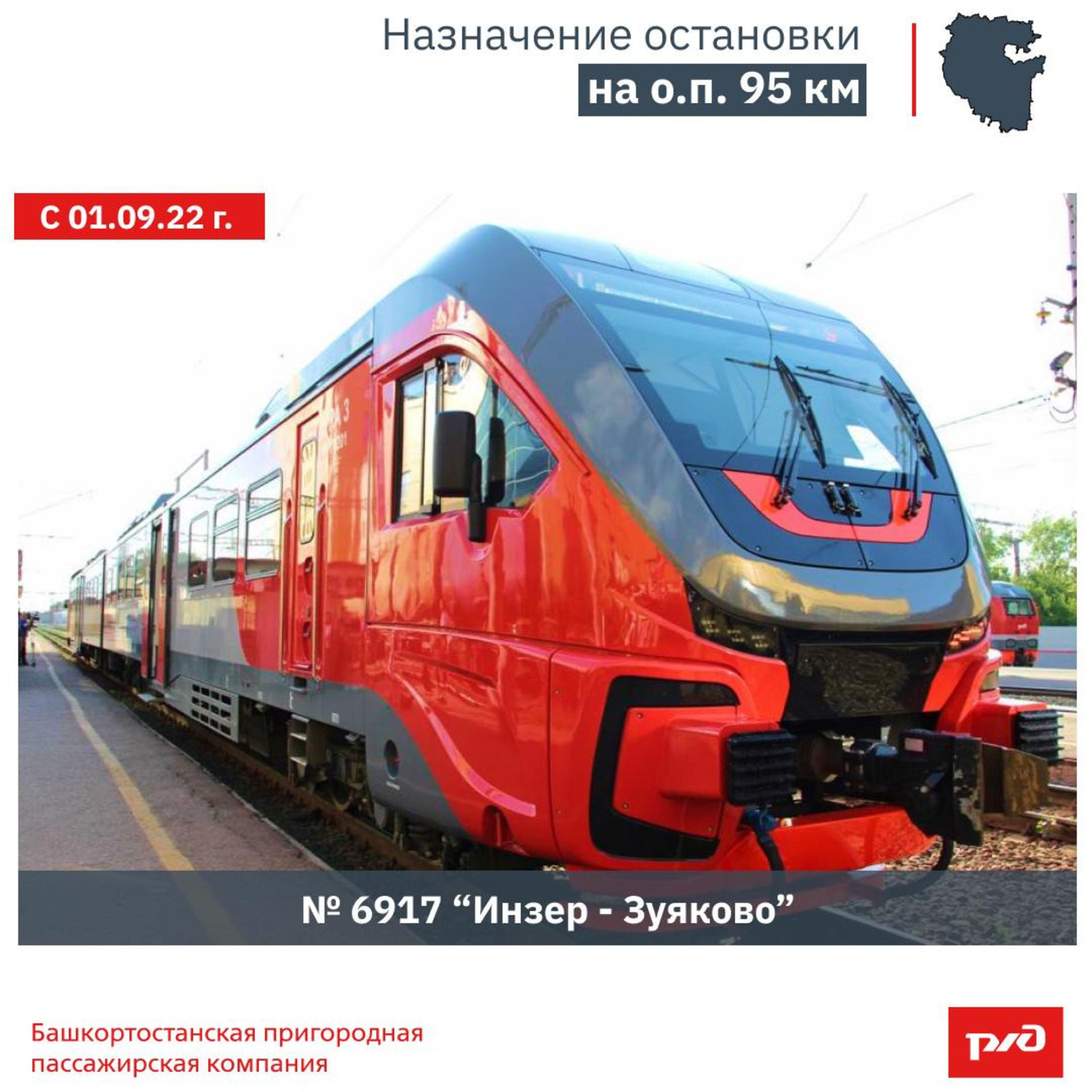 В целях обеспечения максимального комфорта и удобства Пассажиров с 1 сентября 2022 года назначается остановка на о.п. 95 километр пригородному поезду № 6917 сообщением «Инзер – Зуяково».