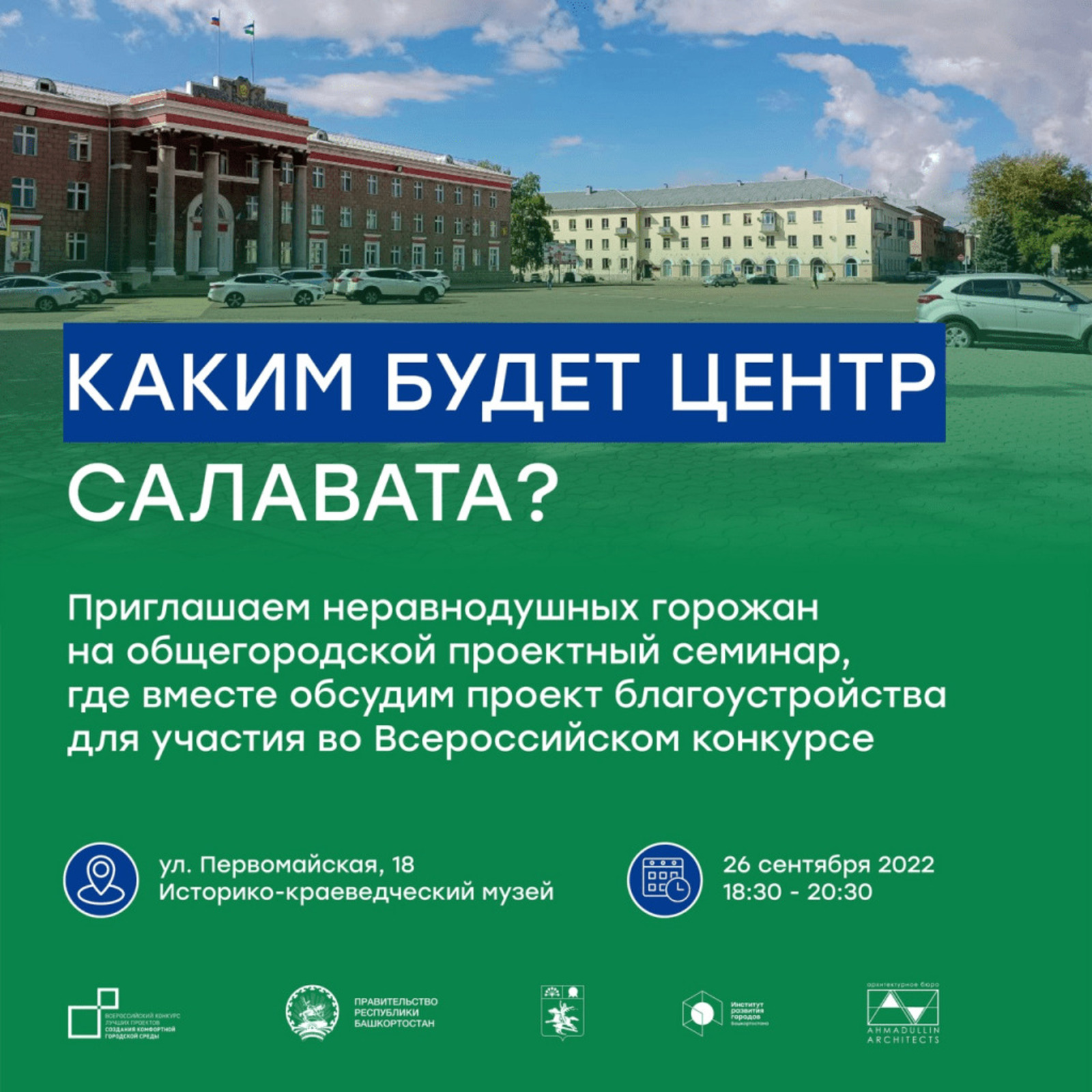 Для того чтобы понять, что именно жители Салавата хотят видеть на площади, команда разработчиков ждёт активных горожан на проектном семинаре. 26 сентября в Историко-краеведческом музее (ул. Первомайская, д. 18) с 18:30 до 20:30 часов специалисты администрации города, планировщики, социологи, архитекторы, дизайнеры, краеведы и все, кто хочет внести свой штрих в портрет города, обсудят проект.