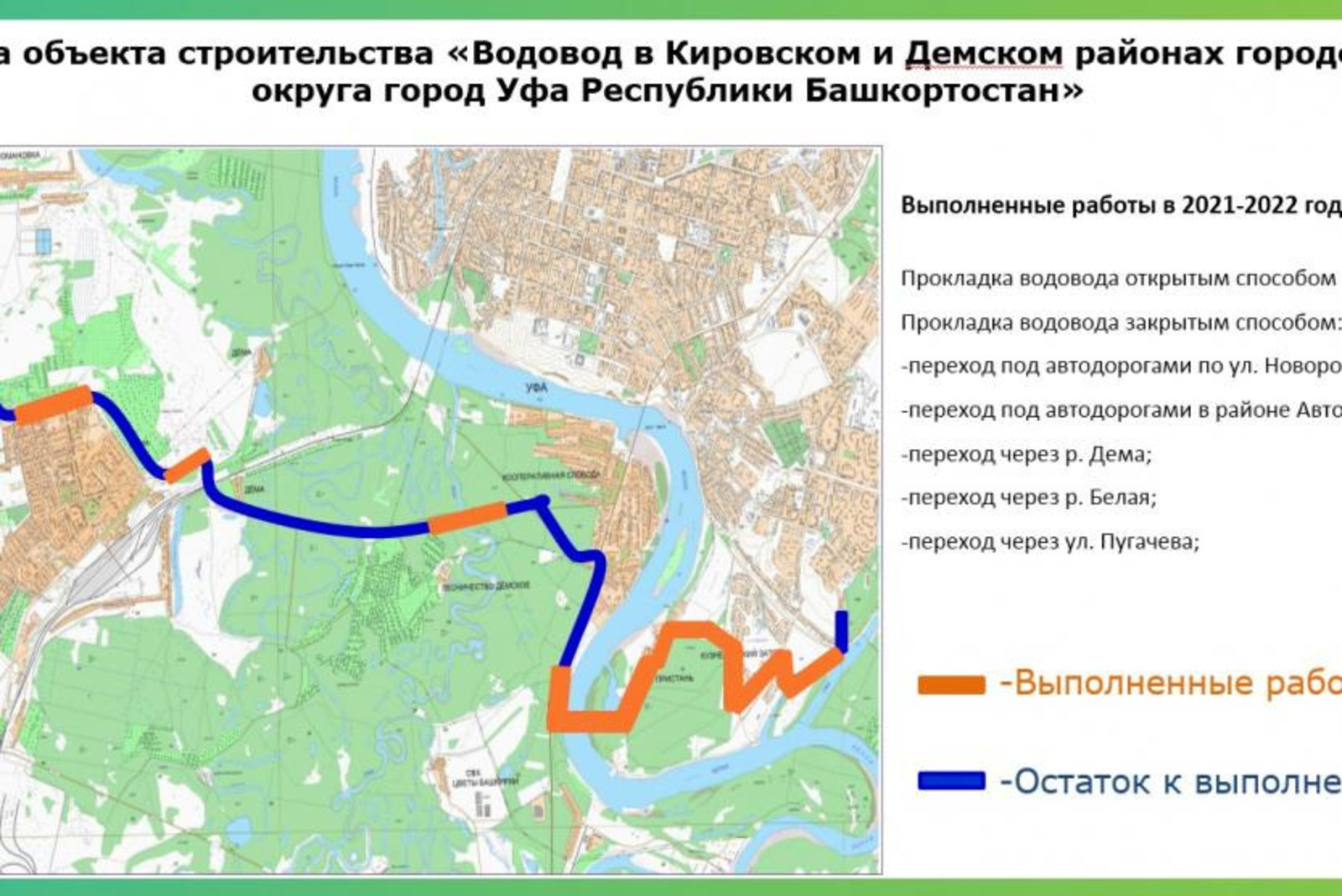 Работа по возведению объектов коммуникаций состоит из нескольких этапов. Один из них - строительство водовода в Кировском и Дёмском районах Уфы. Водовод будет проложен в том числе и вдоль улиц Пугачёва и Колгуевской. Строительно-монтажные работы запланированы открытым способом.