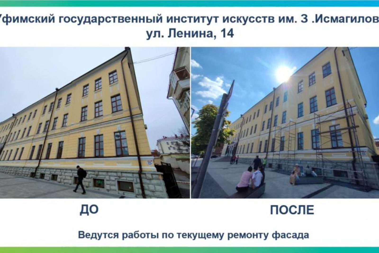 В Уфимском государственном институте искусств имени Загира Исмагилова ООО "Артель" ремонтирует и красит элементы экстерьера. Ремонт выполняется за счет собственных средств университета. Стоимость работ - 600 тысяч руб.