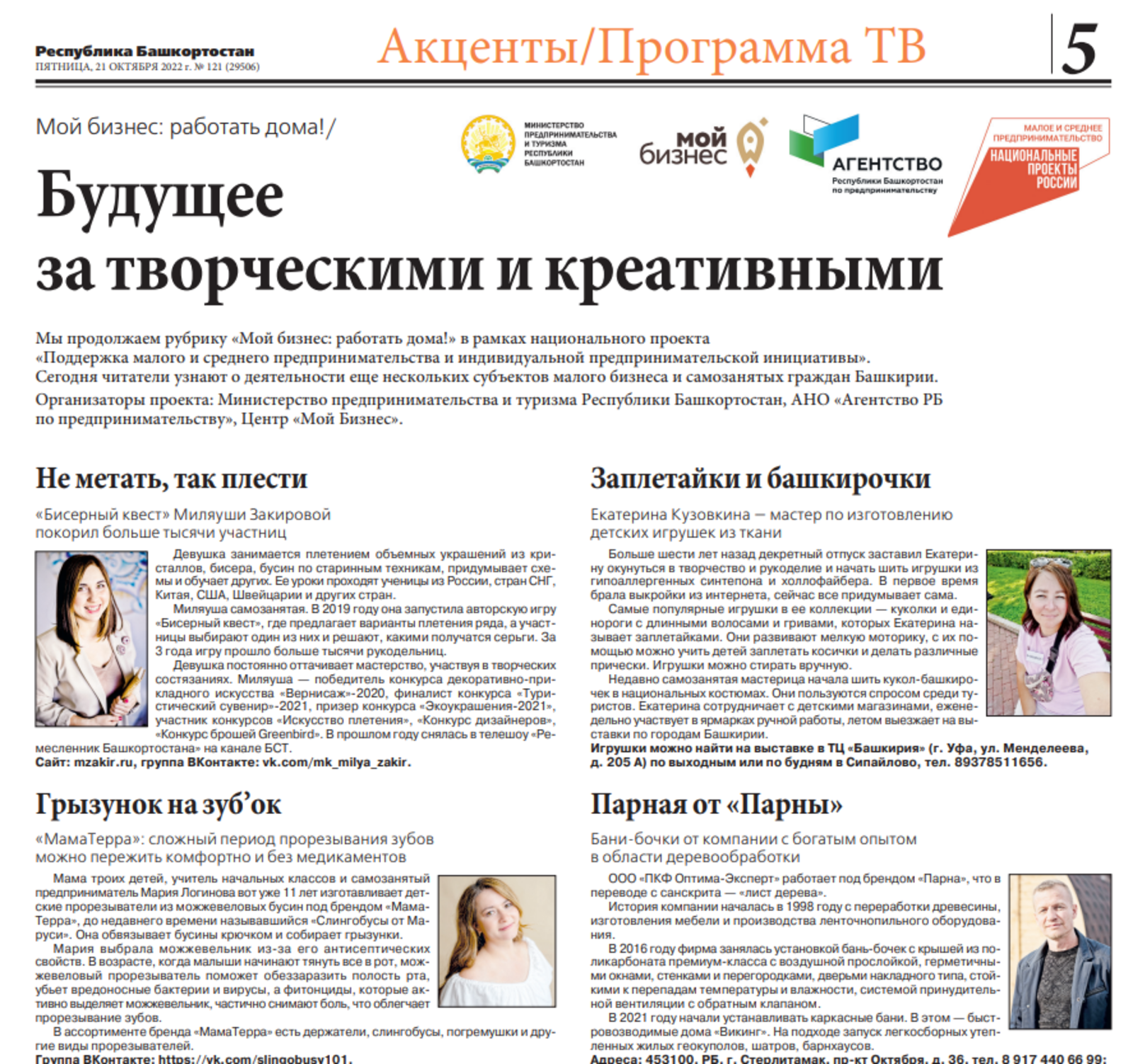 Участники проекта получают возможность бесплатно рассказать о своем предприятии или ИП на страницах ведущих печатных изданий, в роликах в эфире телеканалов и радиостанций республики. Так, в главной общественно-политической газете региона «Республика Башкортостан» уже вышло два специальных выпуска, посвященных этой теме. В них – небольшие материалы о креативе и успехе местных предпринимателей. Информационная поддержка в непростых экономических условиях крайне важна и самозанятому гражданину, и бизнесмену «средней руки».