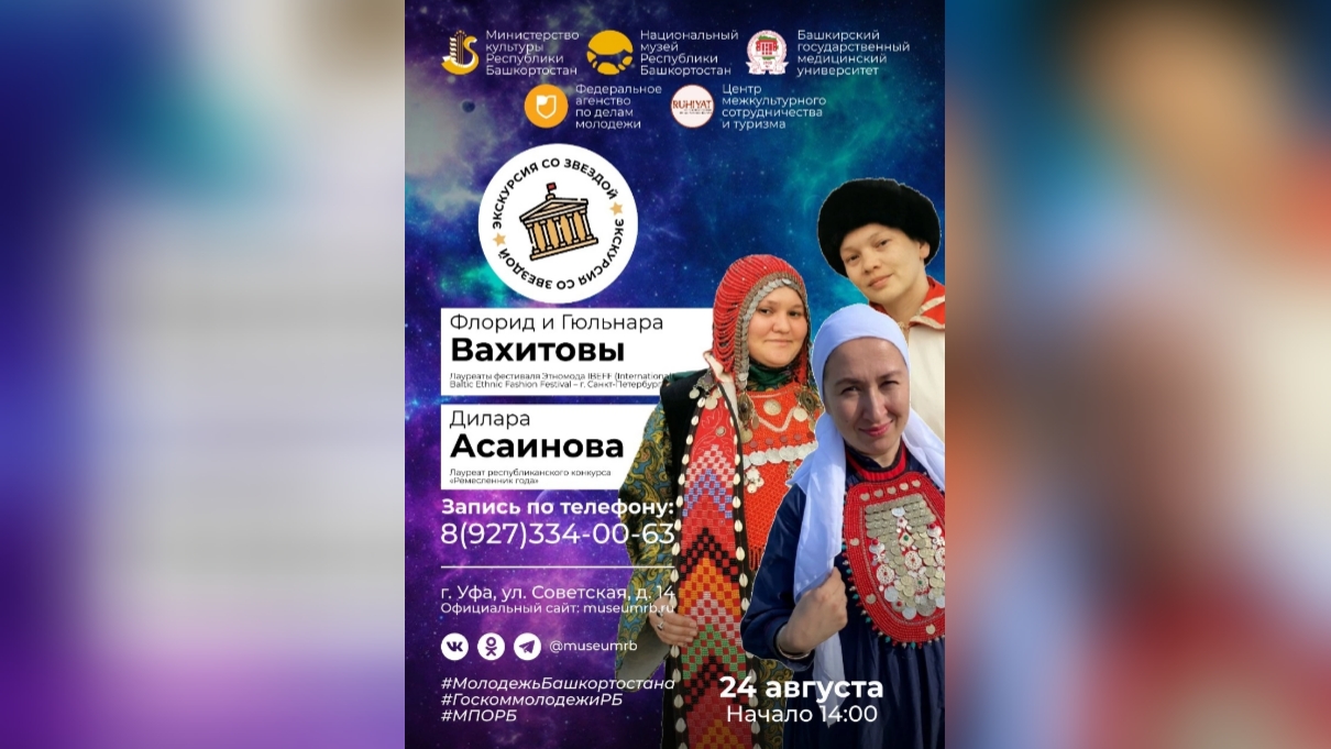 24 августа в Национальном музее Республики Башкортостан состоится очередное мероприятие «Экскурсия со звездой». По задумке организаторов проекта экскурсию проводят известные личности республики. В этот раз гидами станут уфимские этнодизайнеры Дилара Асаинова, Гюльнара и Флорид Вахитовы.