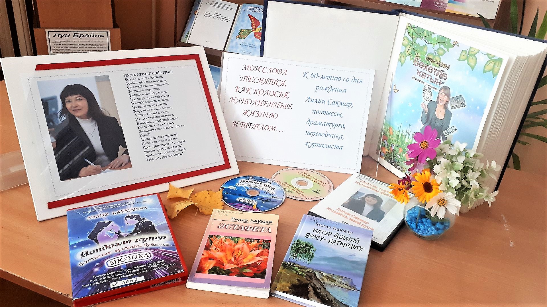 Абонемент Башкирской республиканской специальной библиотеки для слепых имени Макарима Хусаиновича Тухватшина представляет вниманию гостей и читателей книжную выставку «Мои слова теснятся, как колосья, наполненные жизнью и теплом…». Выставка посвящена 60-летию со дня рождения Лилии Зайнулловны Каиповой (псевдоним в литературе Лилия Сакмар) — российской поэтессы, драматурга, переводчика, журналиста. Члена Союза писателей РБ и РФ, Члена Союза журналистов РБ и РФ. Члена Международного литературного фонда. Автора более 100 статей и 5 книг, автора слов более 20 эстрадных песен и хоровых циклов.