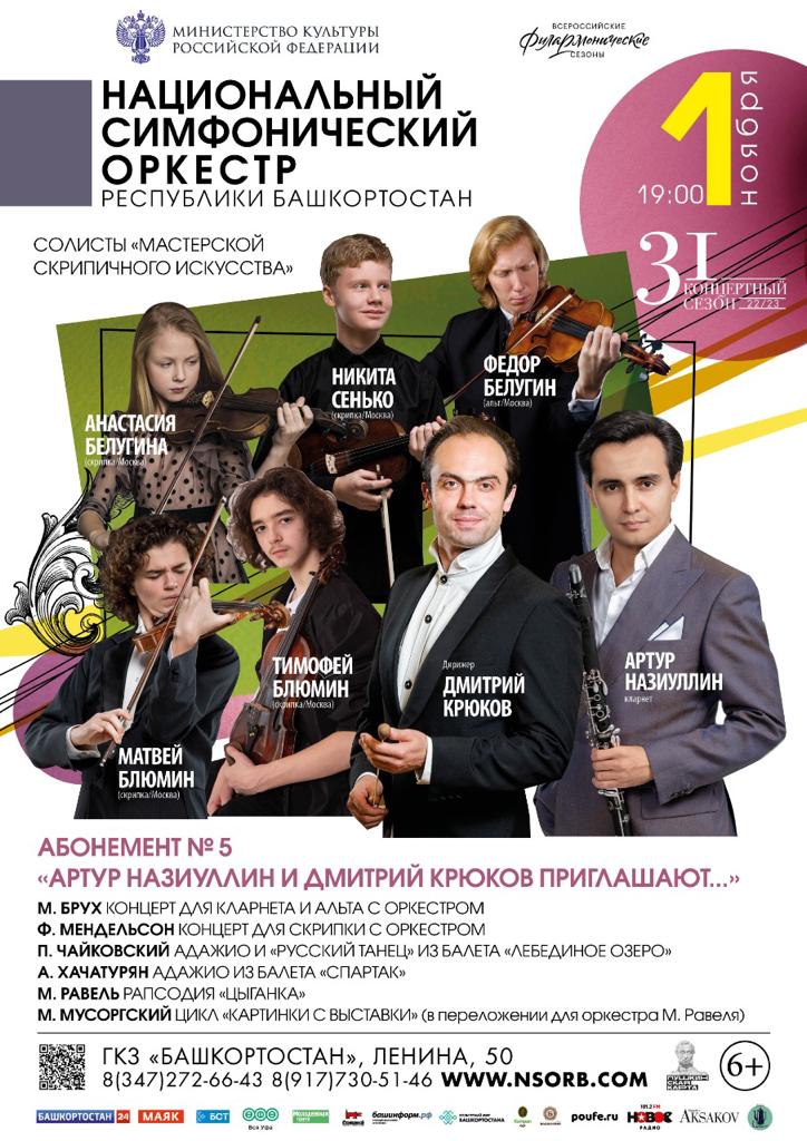 Легендарные солисты, звезды мирового музыкального искусства Матвей Блюмин (скрипка/Москва), Тимофей Блюмин (скрипка/Москва), Анастасия Белугина (скрипка/Москва), Никита Сенько (скрипка/Москва), Федор Белугин (альт/Москва) и Артур Назиуллин (кларнет) под управлением блистательного главного дирижера НСО РБ, лауреата Государственной премии имени Салавата Юлаева, заслуженного артиста РБ Дмитрия Крюкова представят виртуозные произведения выдающихся композиторов – Макса Бруха, Феликса Мендельсона, Петра Чайковского, Антонио Вивальди и Мориса Равеля, в том числе знаменитый цикл «Картинки с выставки» Модеста Мусоргского в оркестровке Равеля.