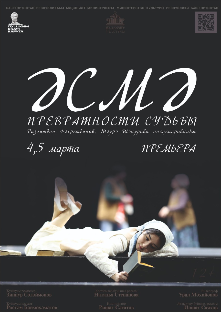 4 и 5 марта в Большом зале БАТД им.М.Гафури состоится премьера спектакля “Әсмә” /”Превратности судьбы” по произведению Ризаитдина Фахретдинова “Асма, или Проступок и наказание”. Режиссер-постановщик - Зиннур Сулейманов, автор инсценировки - Шаура Щакурова, художник-постановщик – Рустем Баймухаметов, художник по костюмам – Наталья Степанова, хореография – Алина Мустаева, художник по свету – Светлана Насонова.