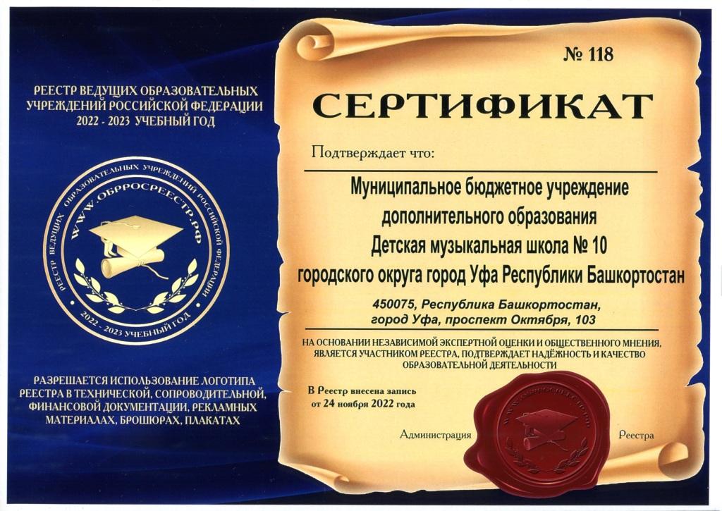 В Единый Национальный Реестр Ведущих учреждений образования, просвещения, а также дошкольного воспитания Российской Федерации вошла детская музыкальная школа № 10 города Уфы. Включение в него означает признание лидирующей позиции и вклад в развитие науки, образования и просвещения региона и России в целом.