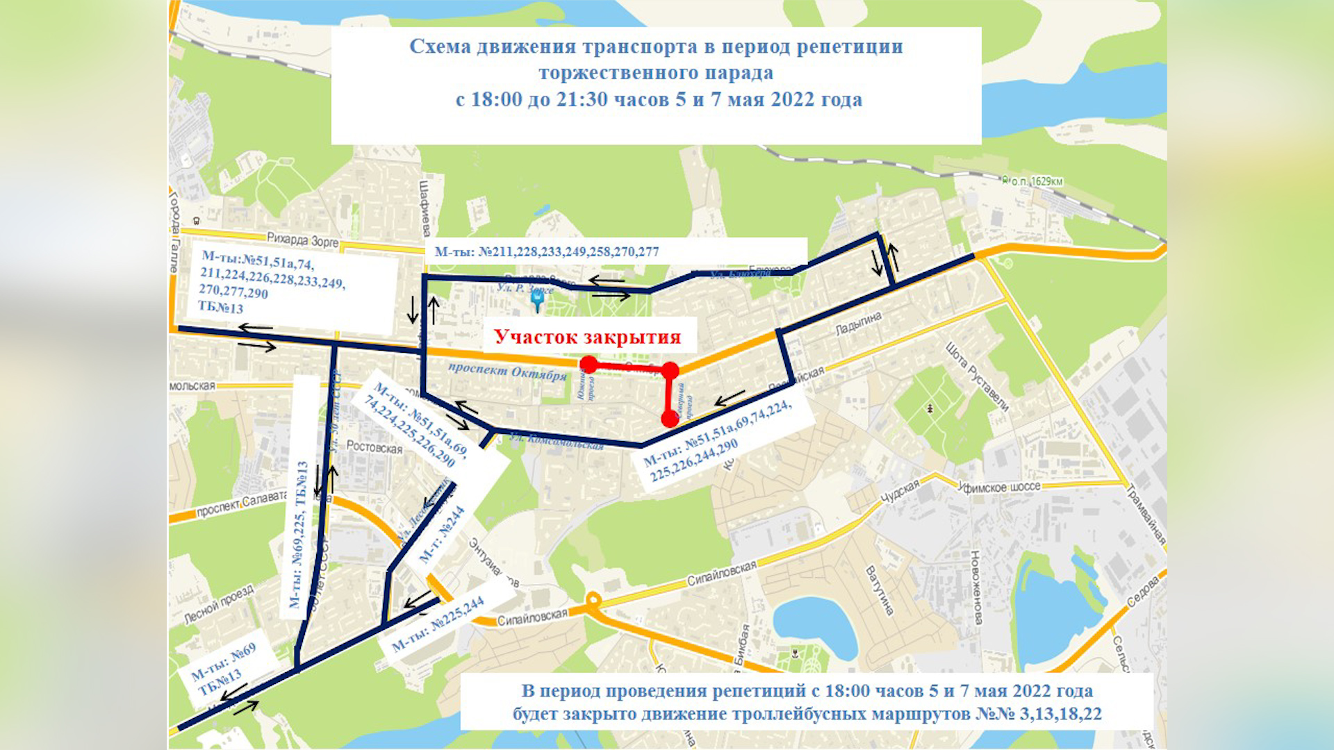 Как сообщили в пресс-службе Администрации Уфы , для проведения репетиций торжественного прохождения военнослужащих 5 и 7 мая с 18:00до 21:30ч. ограничат движение транспорта: