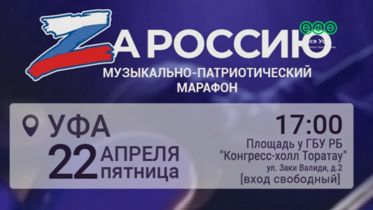 На территории Республики Башкортостан музыкально-патриотический марафон «ZaРоссию» с участием республиканских артистов пройдет с 22 апреля по 24 апреля. Программа марафона включает четыре музыкальных маршрута с охватом 8 городов и сел республики. В составе участников марафона: заслуженные артисты Республики Башкортостан Zainetdin, Рамиль Бадамшин, Раиль Уметбаев, заслуженный деятель культуры РБ Александр Лынник, этно-группа «Аргымак», Карина Низамова и группа «Prado», солисты Башкирской государственной филармонии имени Хусаина Ахматова Полина Кобец, Альфия Нигматуллина, Алиса Жумагалиева, Ильдар Абдуллин, солист уфимского Городского Дворца Культуры Радмир Хасанов, Вильдан Абраров и творческие коллективы муниципальных районов и городских округов республики.