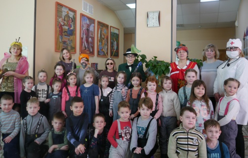 Затем к ребятам пришли нарядные сказочные герои сказок Чуковского – доктор Айболит, Крокодил, Бармалей, Муха-Цокотуха, Таракан и бабушка Федора. Каждый герой рассказывал о себе, из какой он книги, а ребята угадывали. Далее все присутствующие ответили на вопросы викторины по стихам и сказкам писателя, показали хорошие знания. Завершилось мероприятие веселыми танцами вместе с героями произведений, а потом дети прошлись по залам библиотеки и прослушали обзор книг у книжной выставки «Чудо-книги дедушки Корнея».