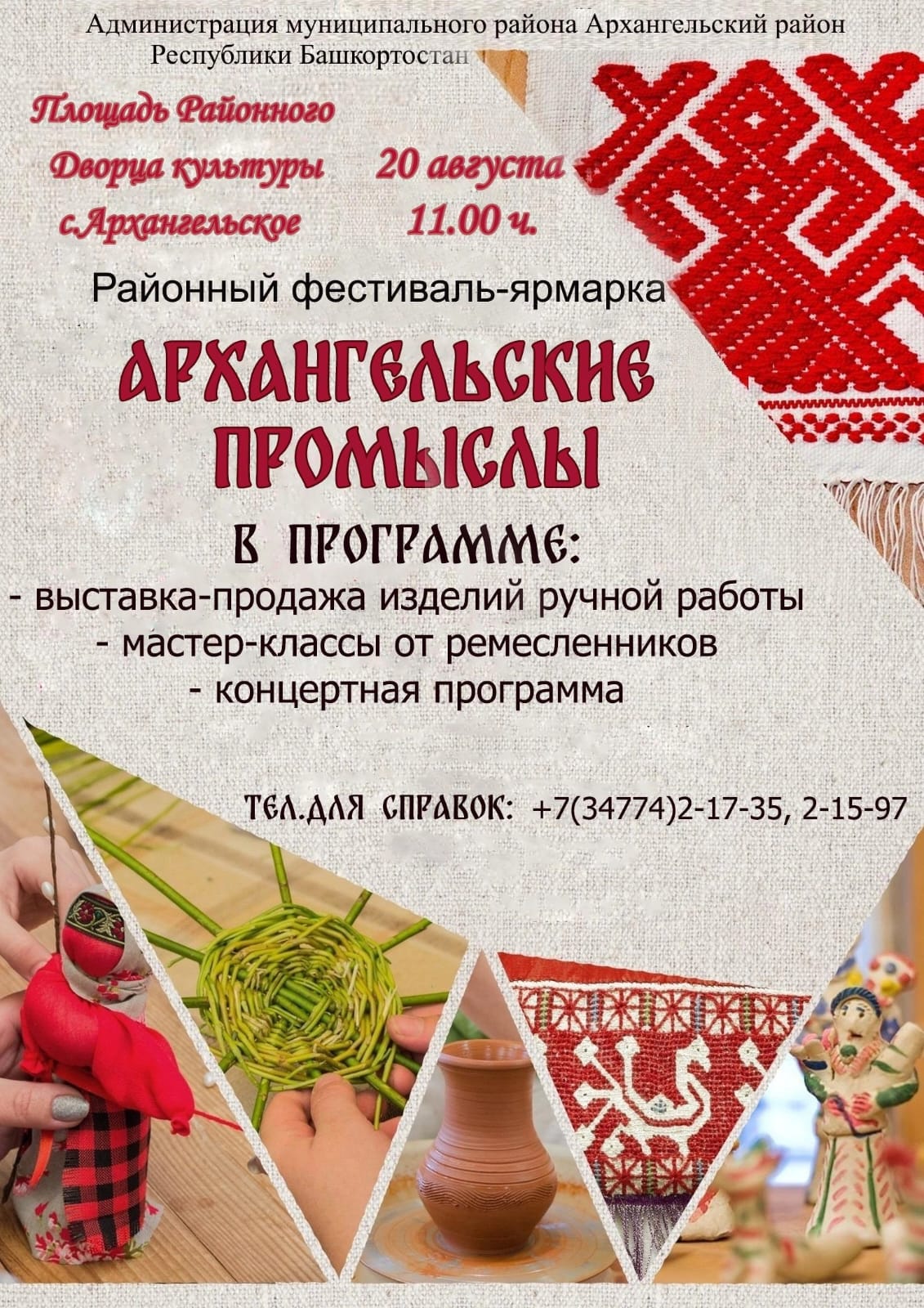 «Архангельские промыслы» - это возможность прикоснуться к удивительной и неповторимой красоте культуры народов Республики Башкортостан, радующего невероятным творчеством талантливых и умелых мастеров. Здесь - вдохновение, культура, история, встреча единомышленников, которые влюблены в искусство и рады поделиться им с окружающими!