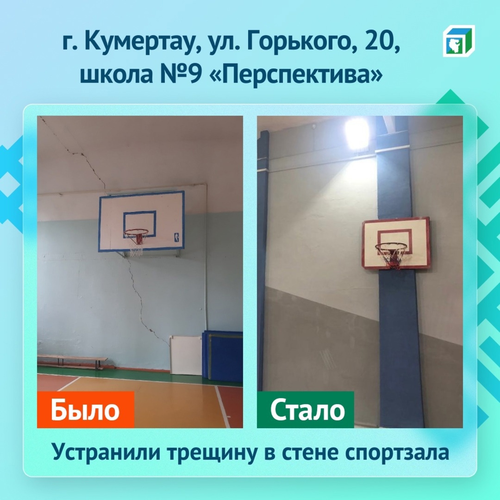 Сообщение зафиксировали информсистемы ЦУР, к решению проблемы подключили администрацию города Кумертау. Комиссия обследовала спортзал и обнаружила трещину в стене. Составили акт осмотра, согласно которому трещина не угрожала разрушением здания. Устранить трещину запланировали до конца учебного года — до 20 мая 2022 года. К выполнению ремонтных работ привлекли проектный институт «Башжилкоммунпроект», он дал заключение с указанием всех необходимых мероприятий.