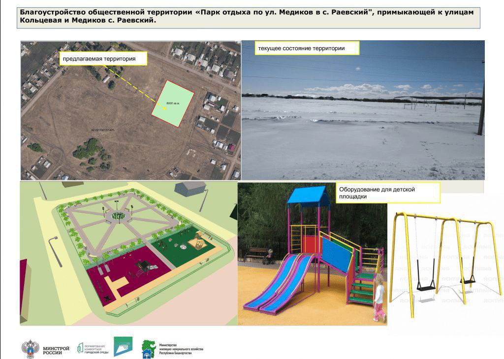 На выбор предложено две территории, благоустройство которых возможно в 2023 году: это «Парк отдыха по ул. Булатова в с. Раевский" (мкр. Янаул) и благоустройство общественной территории «Парк отдыха по ул. Медиков» в с. Раевский.