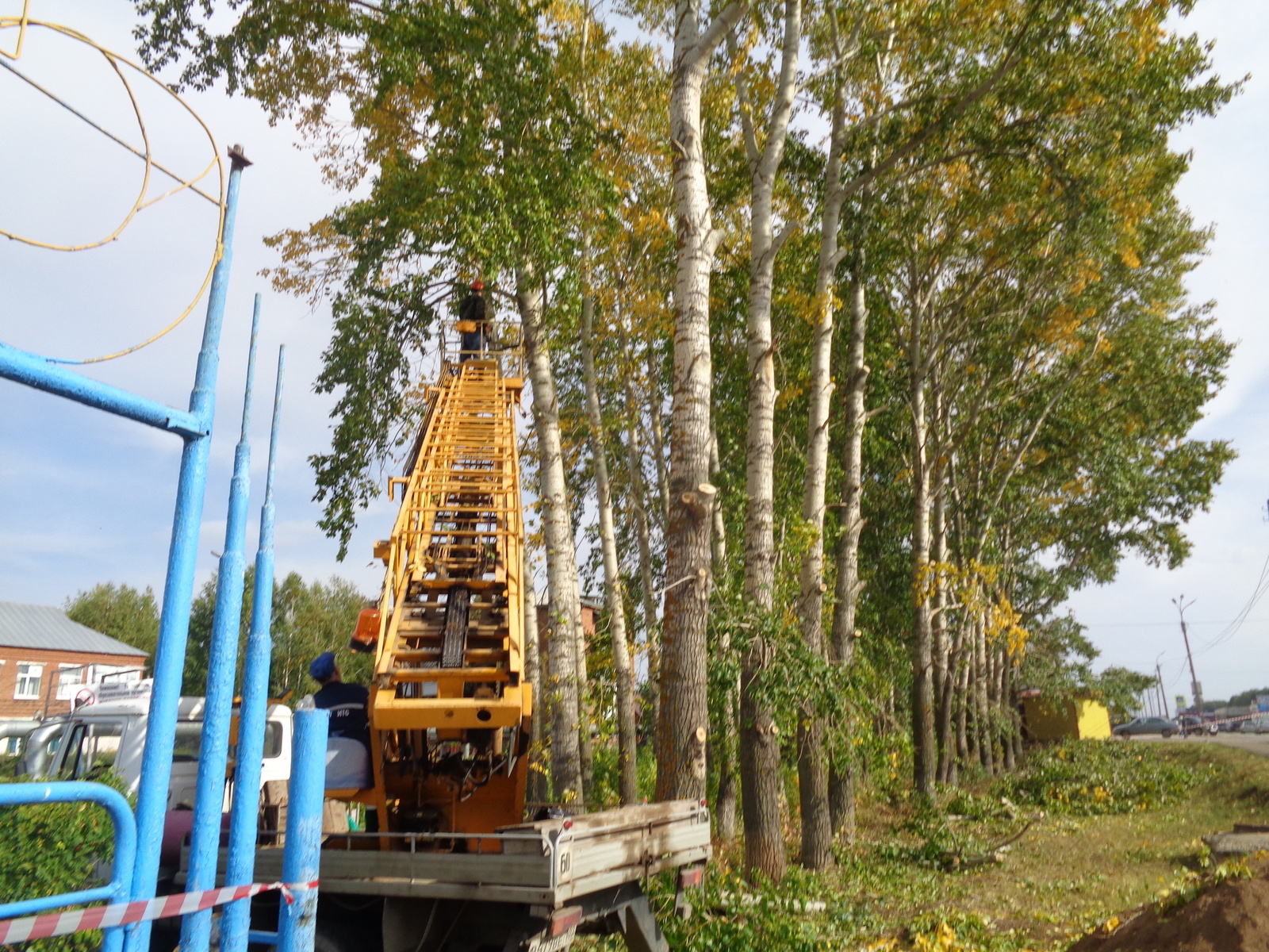 Рабочая зона огорожена сигнальными лентами. Группа службы чистоты и порядка в количестве 6 рабочих в оранжевых жилетах и мастера занимаются подготовкой тополей к сносу – полностью срезают ветви. Они в отдельных случаях достигают пяти метров, то есть как самостоятельные деревья. В результате остаются «голые» стволы.
