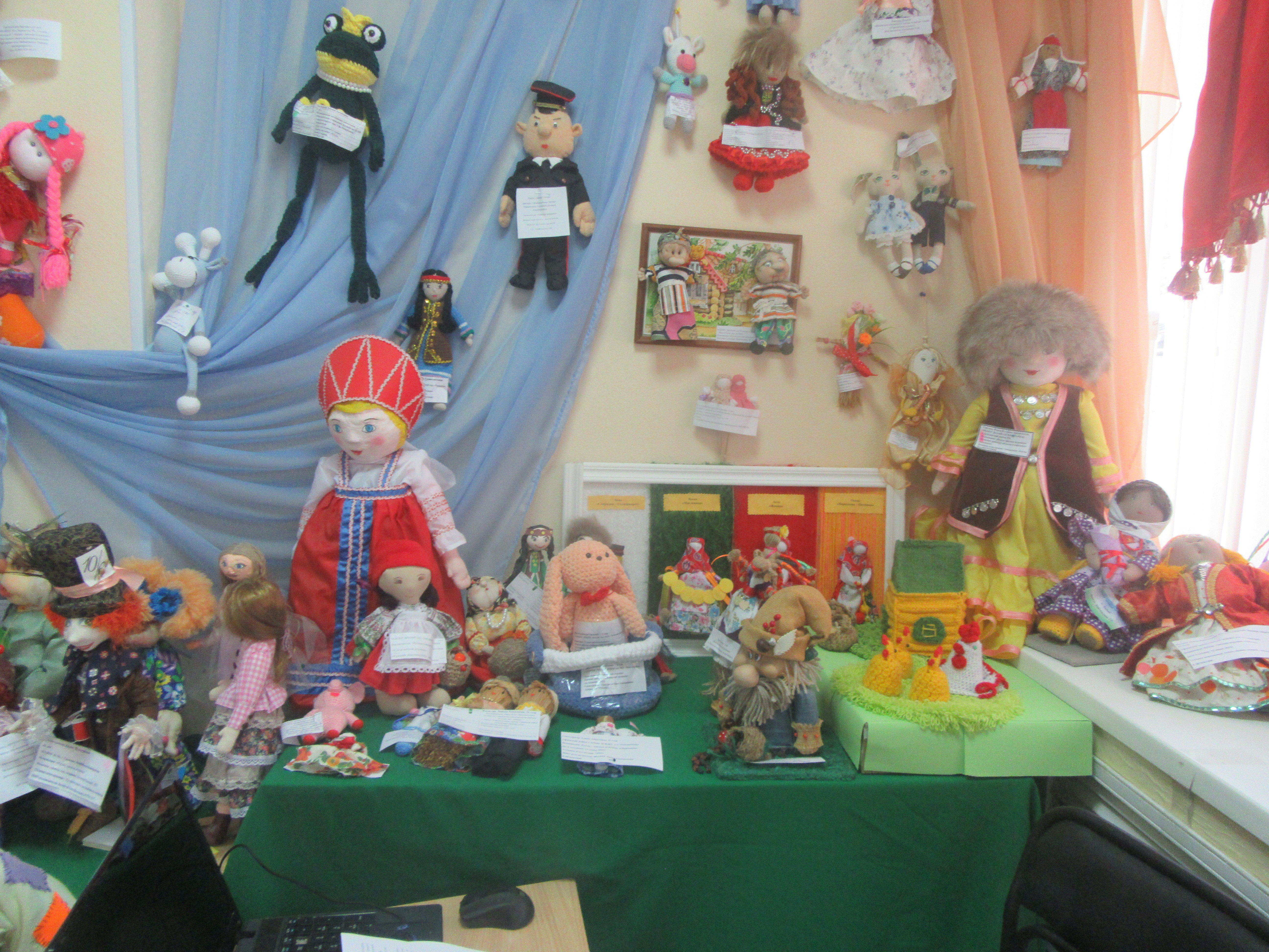 И, наконец, состоялась церемония торжественного подведения итогов. Стены зала, где проходила церемония награждения, сплошь были увешаны конкурсными работами. Шустрые куклята взбирались на колонны, цеплялись за веревочки, оккупировали любую поверхность и дверные проемы. Все это живо напоминало сценку из сказки про цветик-самицветик, когда девочка Женя пожелала иметь всех кукол на свете, и они толпой сбежались к ней со всех сторон. Красные Шапочки, Безумный Шляпник, царевны-лягушки в тюлевых юбочках и с оперенными стрелами наготове, Бременские музыканты в полном составе, длинноносые Буратино, башкирские егеты, красавицы-принцессы, бабушки и дедушки, Колобок - румяный бок, вся компания по вытаскиванию репки, три поросенка - словом, здесь собрались знакомые всем с самого юного возраста сказочные и книжные персонажи. В ход шли разнообразные материалы: бумага и картон, текстиль и пряжа, папье-маше, искусственный мех, джутовая бечевка, вплоть до мочальной метлы без палки для крыши избушки и поролоновых губок, призванных изобразить Нуф-Нуфа с его непутевыми братцами.