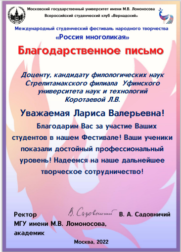 Поздравляем с победой в Международном фестивале народного творчества «Россия многоликая» студентов ФБиТФ СФ УУНиТ
