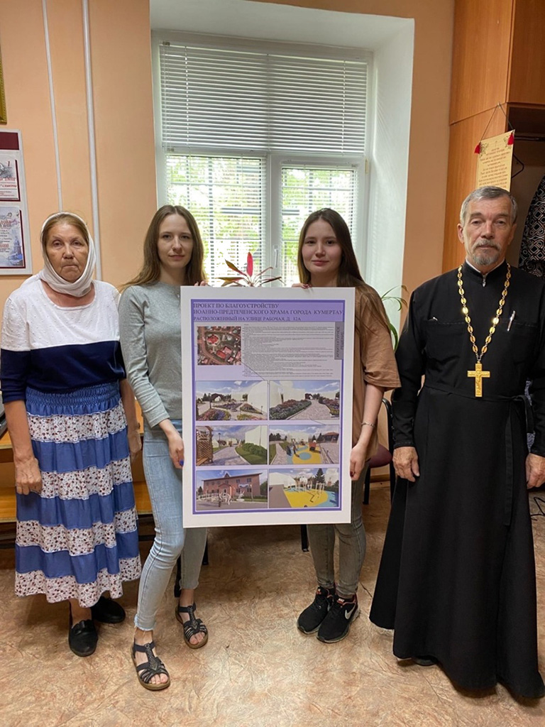 В этом году проект студенток направления подготовки 08.03.01 «Строительство» Карины Микушевой и Натальи Валишиной был выполнен по тематике благоустройство прилегающей территории к Иоанно-Предтеченскому соборному храму. Девушки разработали проект по техническому заданию от настоятеля храма г. Кумертау иерея Владимира Быкова. Студентки представили 2 варианта 3D визуализации территории, графическую часть и сметные расчеты.