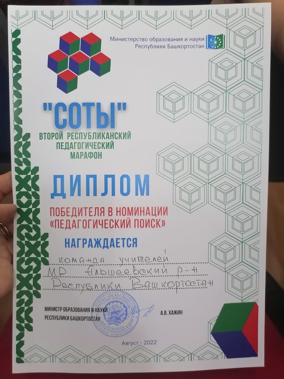 8 августа 2022 года сборная команда учителей Альшеевского района стала победителем в номинации «Педагогический поиск» во втором Республиканском педагогическом марафоне «СОТЫ», который проходил в г.Салават.