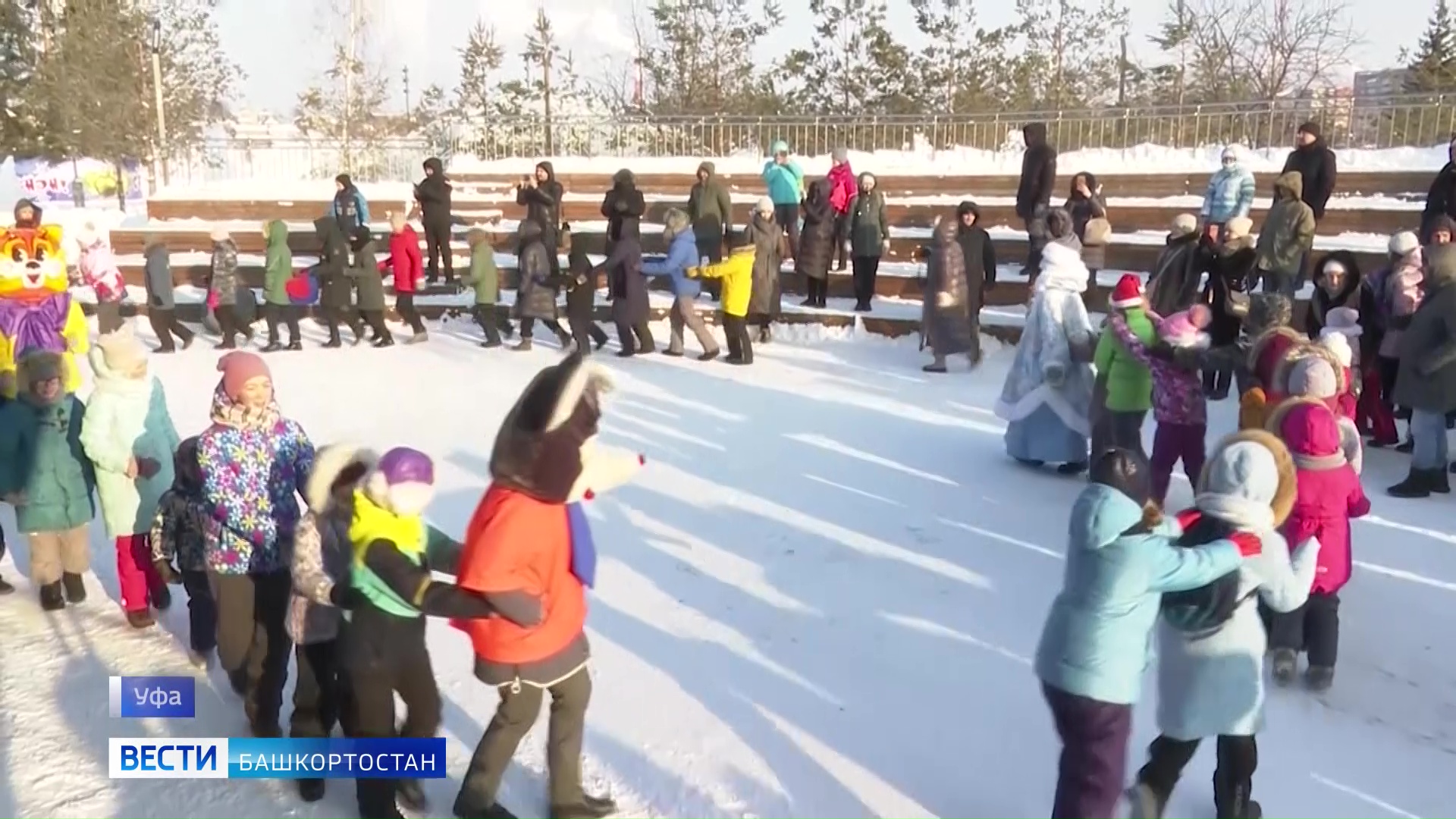 «А в Ленинском районе Уфы подготовили для детей большое новогоднее представление. Но из-за сильных морозов провести его решили в холле Государственного концертного зала «Башкортостан».