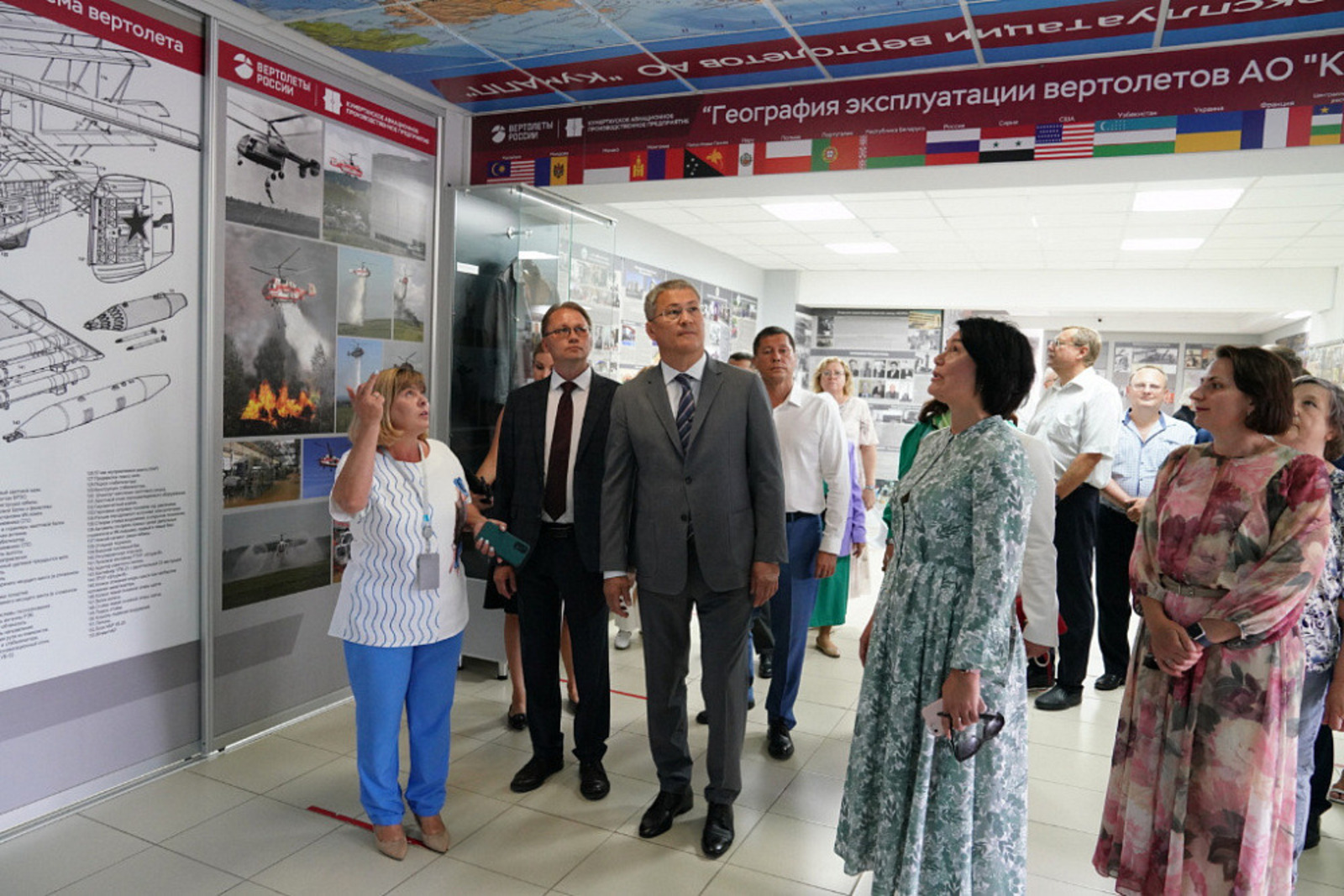 Руководитель региона осмотрел экспозиции, посвящённые строителям Кумертау, фронтовикам, природе Башкортостана. Также Радий Хабиров заглянул в зал Кумертауского авиационного производственного предприятия, где представлена схема двигателя ВК-2500 для модернизированного вертолёта Ка-32.
