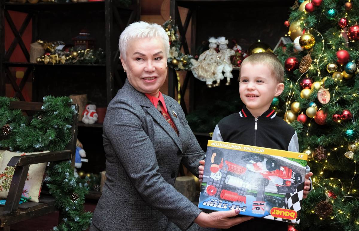 В резиденции Деда Мороза в Городском дворце культуры Римма Баталова вручила маленькому Родиону умную колонку «Алиса» и сладкий подарок, а также конструктор для его младшего брата.