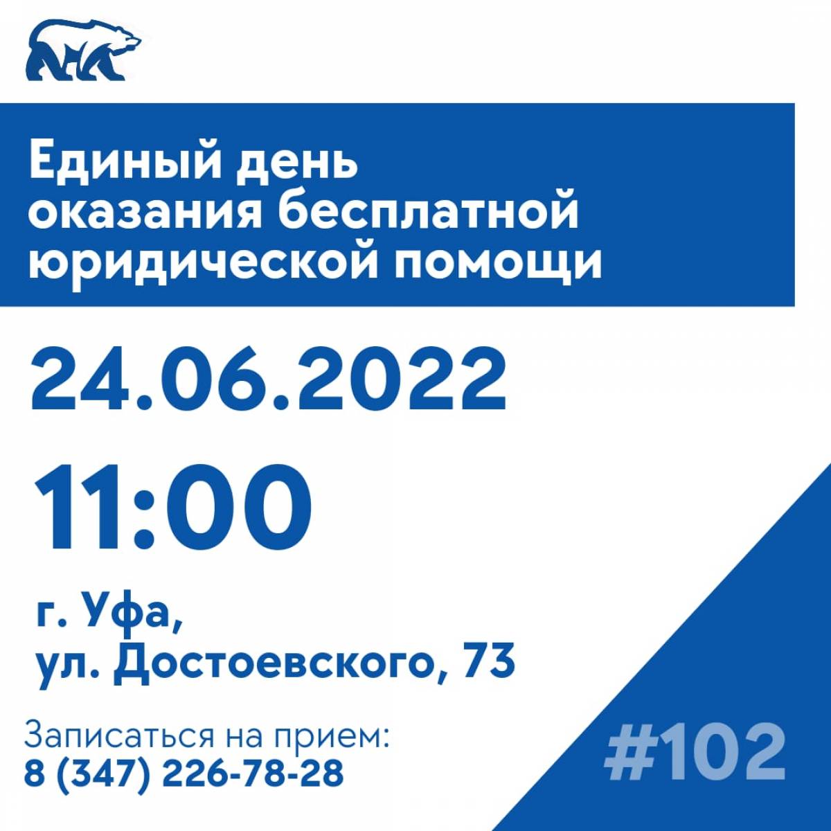 24 июня с 11 до 15 часов в Региональной общественной приемной Башкортостана по адресу: г. Уфа, ул. Достоевского, 73 пройдет Всероссийский Единый день бесплатной юридической помощи.