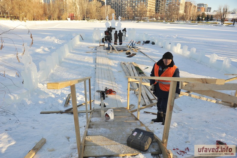 Вчера художники и спасатели начали готовить купель к Крещению Господня. Всего в столице Башкортостана для традиционных купаний будут действовать семь иорданей.- Это одно из самых популярных и массовых мест для окунания, обычно приходят более трех тысяч человек. Поэтому в краткие сроки – за четыре дня, - постараемся создать красоту, - отметил художник Кабир Губайдуллин.