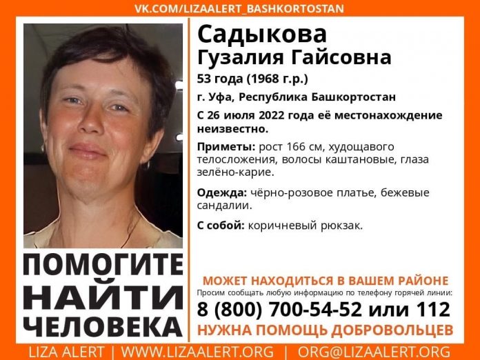 В Уфе разыскивают пропавшую 53-летнюю Гузалию Садыкову, сообщает поисковый отряд «ЛизаАлерт».