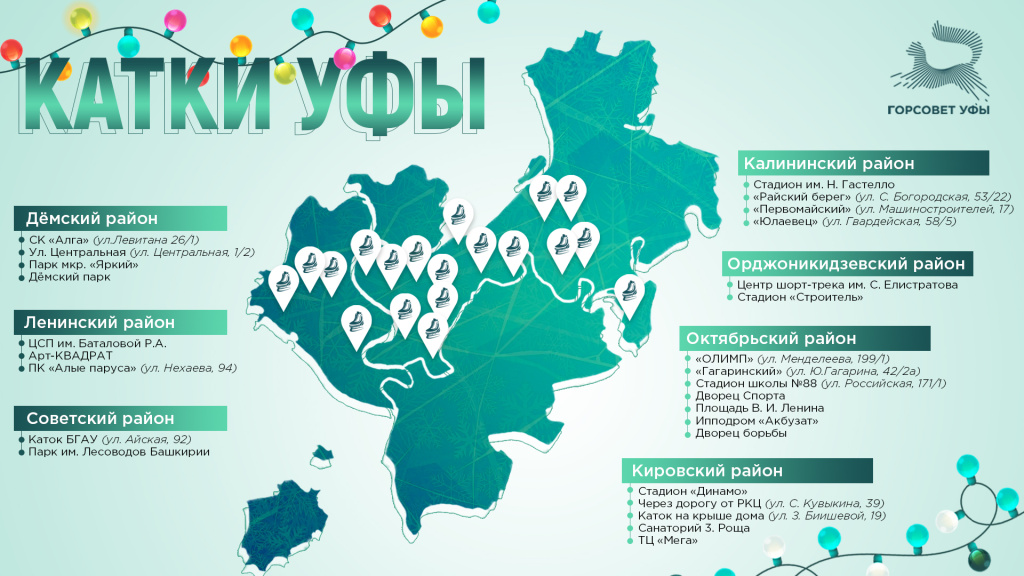 Для всех желающих прокатиться с ветерком на свежем воздухе в для уфимцев и гостей столицы работают три десятка катков. Они расположены на открытых площадках стадионов и в парках, а также на территориях крытых ледовых арен.