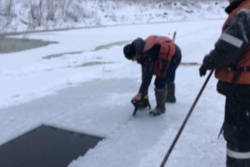 Лед на водоеме пилят специалисты МБУ «Служба по благоустройству Кировского района» Уфы и здесь целая технология.