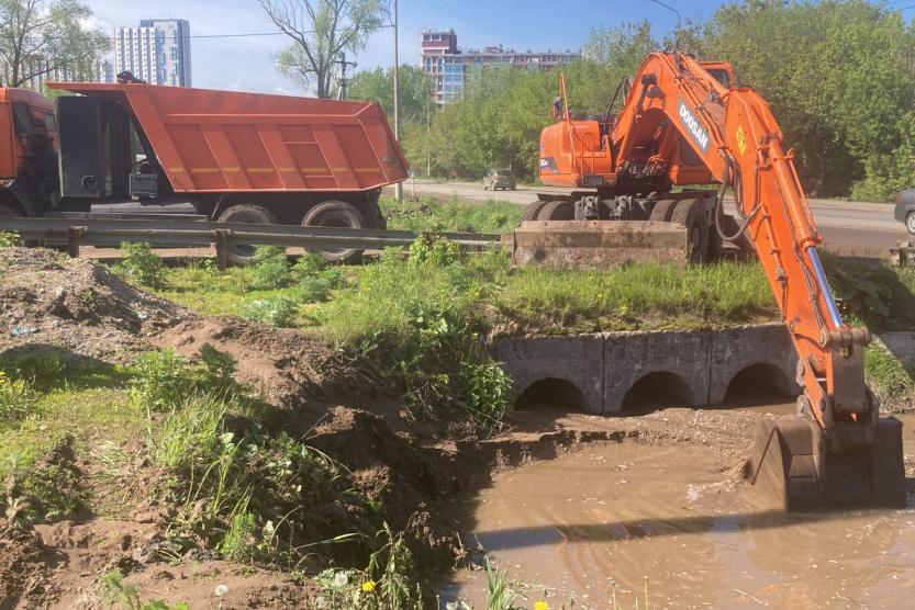 Коммунальные службы в Кировском районе столицы республики проводят очистку ливневого коллектора на улице Пугачева при помощи специальной техники.