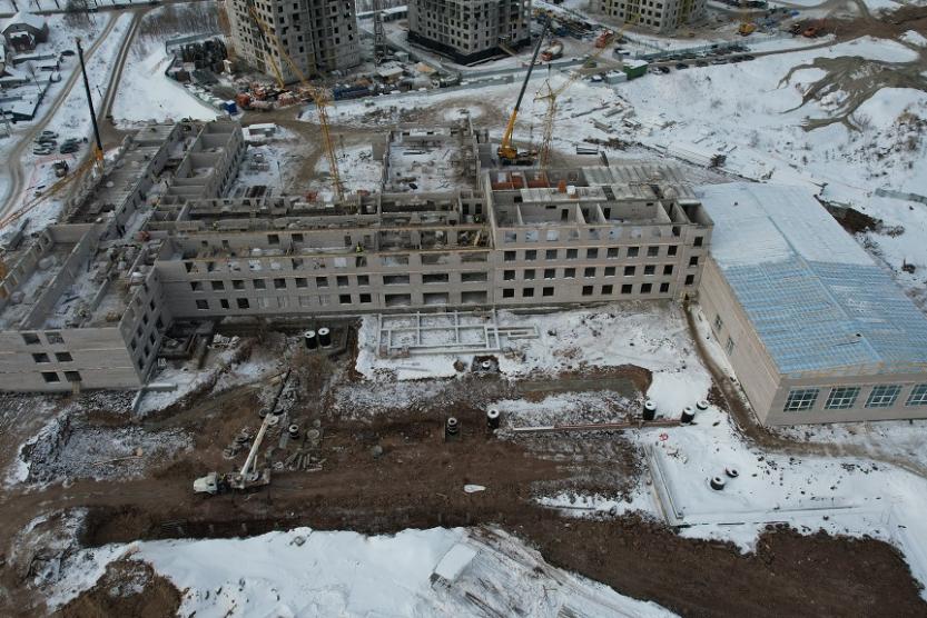 По состоянию на 7 февраля, на объекте в блоках А, Б, В, Г ведутся работы по кирпичной кладке стен и перегородок, завершается устройство кровли блока Д. Одновременно проводится прокладывание инженерных коммуникаций.