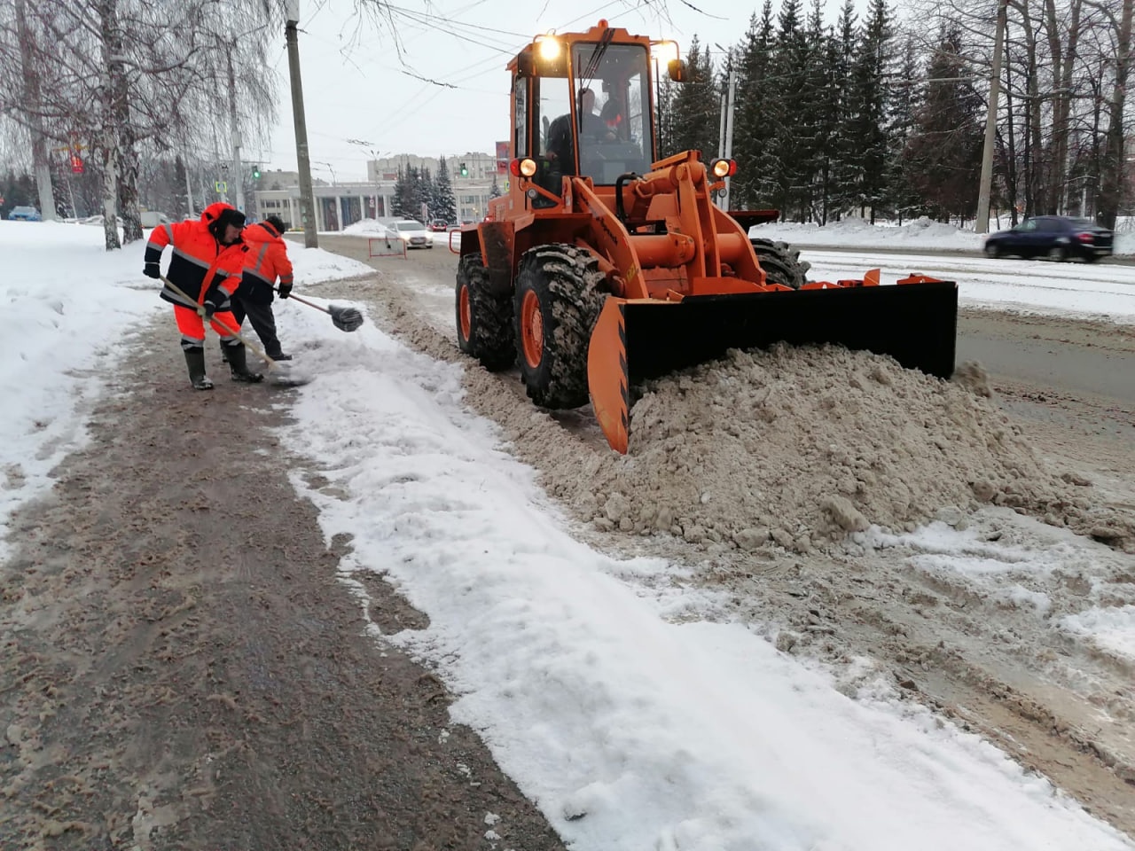 В Кировском районе колонна техники ночью прошла по улице Ленина. Темное время суток было выбрано не случайно: меньше машин и к утру дорога будет чистой. Трактора с массивными ковшами, рабочие с лопатами, грузовики «Камаз» - все работали в связке.