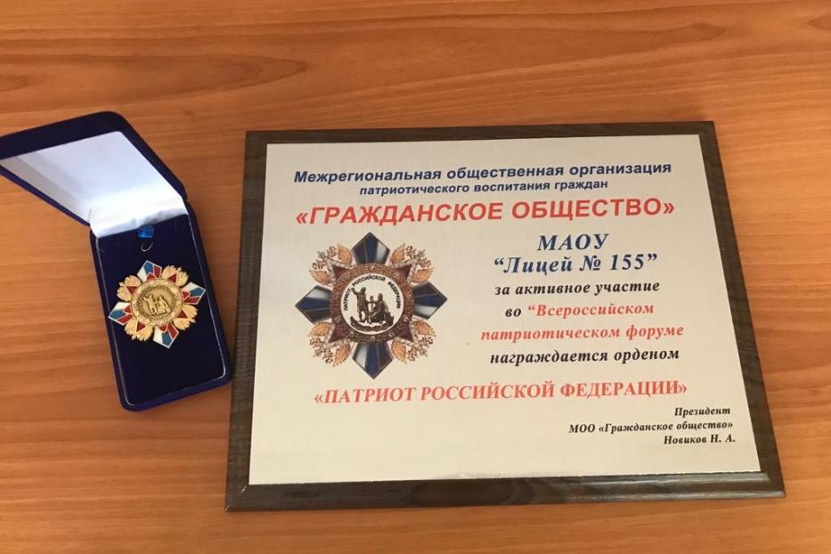 В октябре лицей №155 им.Героя Советского Союза Натальи Ковшовой принял участие во Всероссийском патриотическом форуме «Молодые патриоты России». На одной из площадок был представлен опыт работы лицея по патриотическому воспитанию подрастающего поколения. Организаторы высоко оценили их деятельность. Поэтому за работу, направленную на укрепление мощи и развитие Российской Федерации, деятельную любовь к Родине и вклад в сохранение исконных русских ценностей, лицей был награждён дипломом и орденом «Патриот Российской Федерации».