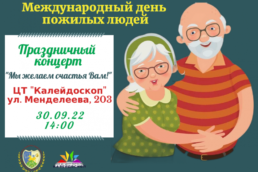 В канун Международного дня пожилых людей в районе пройдет сразу два праздничных концерта. В 14.00 ч. «Мы желаем счастья вам!» - в центре творчества «Калейдоскоп», а в 15.00 ч. «Мы дарим вам частичку сердца!» - в детско-юношеском центре «Салям».