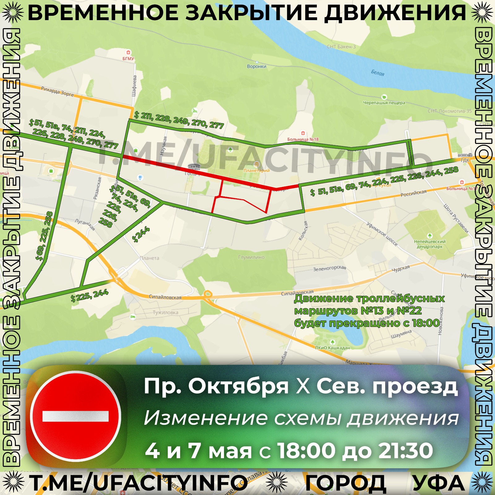 - 7 мая с 18:00 до 21:30 – по проспекту Октября от улицы Шафиева до Кольской; по Северному и Южному проездам от проспекта до Российской; по Новогорной от Южного до Северного проезда.
