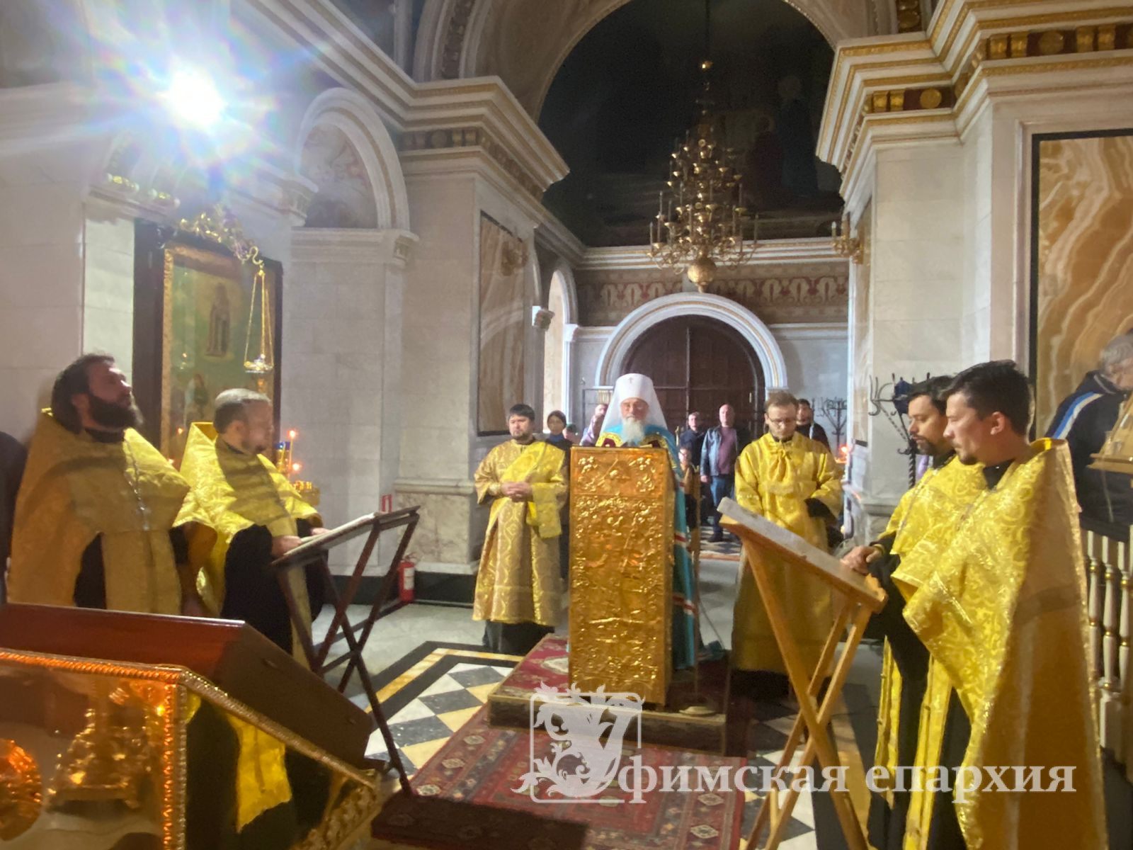 08 октября 2023г., накануне дня преставления святого апостола и евангелиста Иоанна Богослова, митрополит Уфимский и Башкортостанский НИКОН возглавил праздничное вечернее богослужение в кафедральном соборе Рождества Богородицы г.Уфы. За богослужением был прочитан акафист св.ап. Иоанну Богослову. Владыке сослужило соборное духовенство.