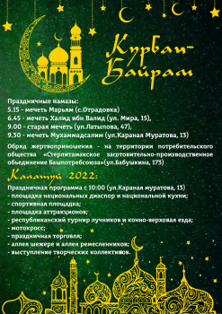 Курбан-байрам – одно из главных событий в исламском календаре. Отмечается праздник в честь окончания Хаджа (паломничества в Мекку) через 70 дней после праздника Ураза-Байрам. Во всех мечетях Стерлитамака и в с. Отрадовка проведут праздничные намазы: