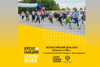 В Стерлитамаке состоится Всероссийский день бега «Кросс Нации-2022». Мероприятие пройдёт 17 сентября в 11:00 в лесопарковой зоне за ГСОК «Содовик».
