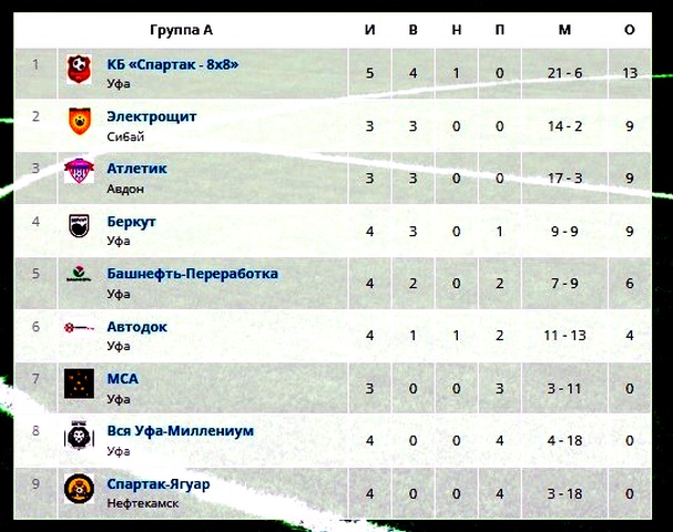 Команды сыграли неравное количество игр, и пока впереди таблицы идет "КБ «Спартак - 8х8» (Уфа).У лидера 4 победы и одна ничья - 13 очков.