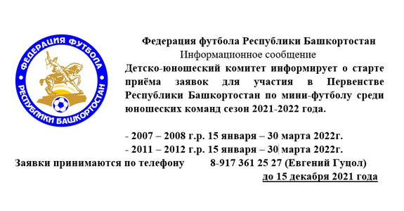 Детско-юношеский комитет информирует о старте приёма заявок для участия в Первенстве Республики Башкортостан по мини-футболу среди юношеских команд сезон 2021-2022 года.