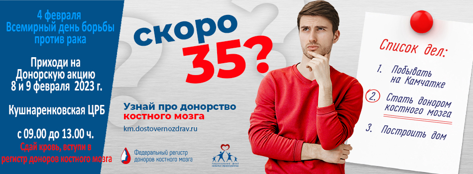 Приглашаем на донорскую акцию "Скоро 35" приуроченную ко Всемирному дню борьбы против рака. Прием доноров пройдет 8 и 9 февраля Кушнаренковском районе с 09.00 до 13.00 часов.