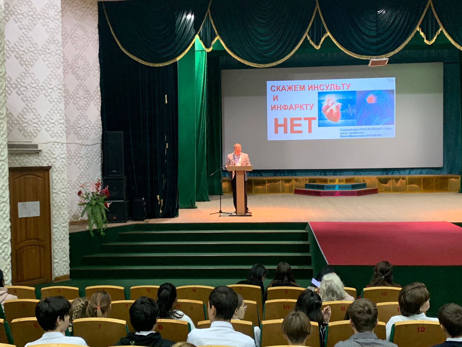 Началось мероприятие с Флеш – моб «Зарядка». Далее, главным врачом ГБУЗ РБ БСМП г. Уфа, главным внештатным специалистом Минздрава РБ по ОНМК Карамовой И.М. проведено образовательное мероприятие «Скажем инсульту и инфаркту НЕТ». В заключение выступления, Ирина Марсиловна провела викторину о здоровом образе жизни с раздачей призов за правильные ответы.