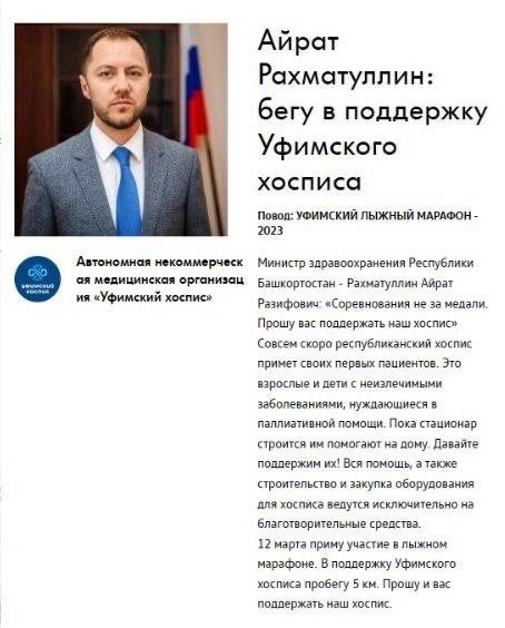 В Уфимском лыжном марафоне, который пройдет в Уфе 12 марта в СОК "Биатлон" примет участие и министр здравоохранения РБ Айрат Рахматуллин. Он побежит в поддержку Уфимского хосписа. Айрат Рахматуллин попросил всех неравнодушных граждан поддержать строительство хосписа.