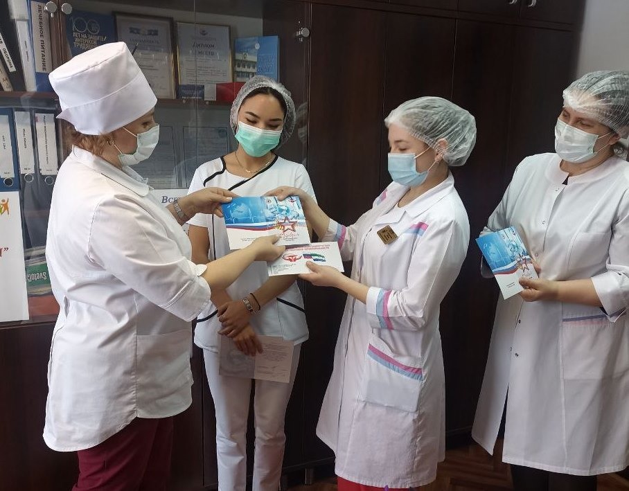 На фото председатель первичной профсоюзной организации ГБУЗ РКИБ Воробьева Н.А. вручает памятные открытки и сертификаты от Администрации ГБУЗ РКИБ и Профсоюза работников здравоохранения РБ
