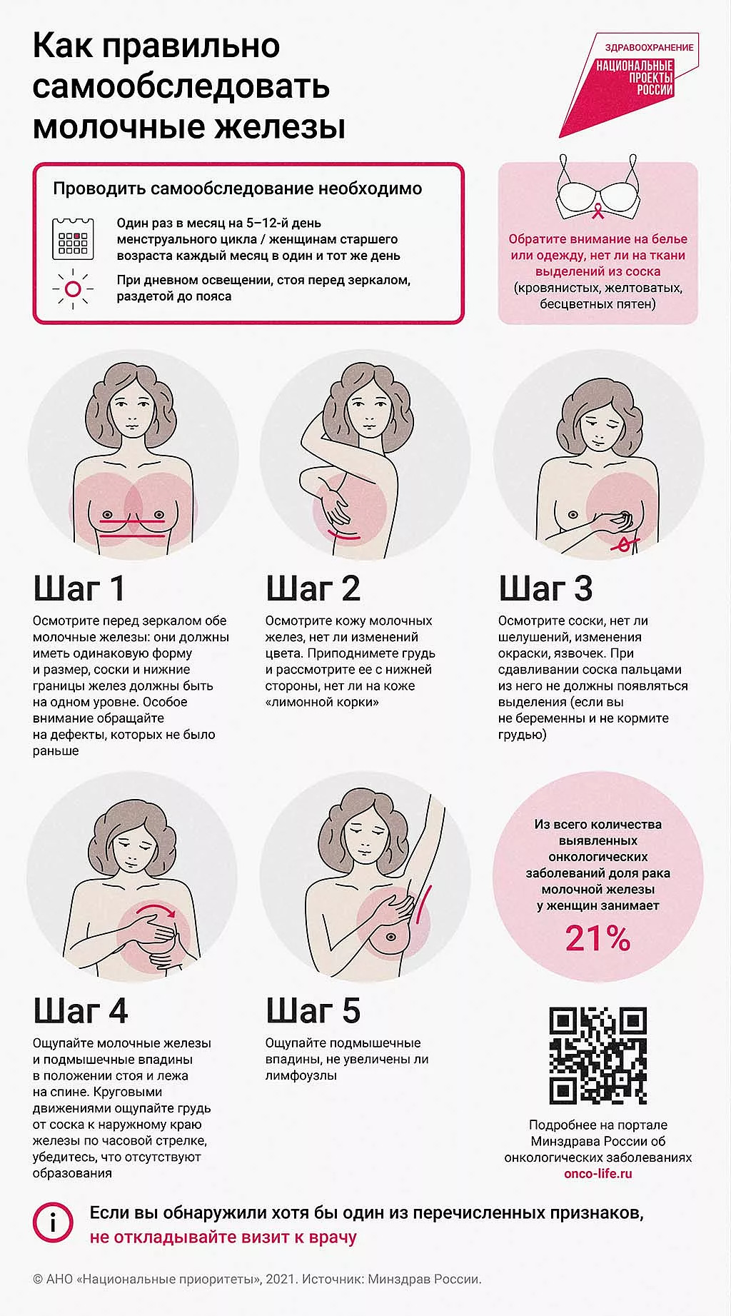 изменение размера, кожи молочной железы (деформация, сморщивание, покраснение, наличие «вмятин» и «впадин»; изменения соска (втянутость, изменение положения и формы соска, сыпь на соске или вокруг него, кровянистые выделения из соска); припухлость и постоянная боль в участке молочной железы или в подмышечной впадине. Лучшей профилактикой заболевания является соблюдение простых правил:регулярное самообследование молочных желез (1 раз в месяц через 7-10 дней после окончания менструаций); периодическе консультации у маммолога с целью своевременного обнаружения и лечения опухоли груди; ежегодное прохождение профилактического медицинского осмотра
