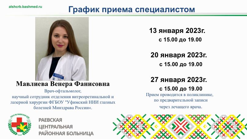 13 января, 20 января и 27 января 2023г. в Раевской ЦРБ проводит прием пациентов врач-офтальмолог, научный сотрудник отделения витреоретинальной и лазерной хирургии ФГБОУ "Уфимский НИИ глазных болезней Минздрава России" Мавлиева Венера Фанисовна.