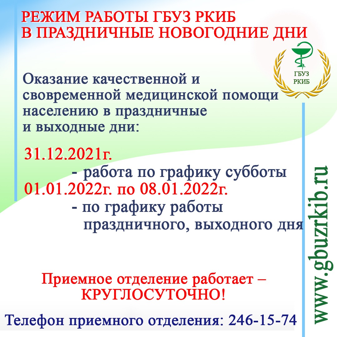 РЕЖИМ РАБОТЫ ГБУЗ РКИБ В ПРАЗДНИЧНЫЕ НОВОГОДНИЕ ДНИ