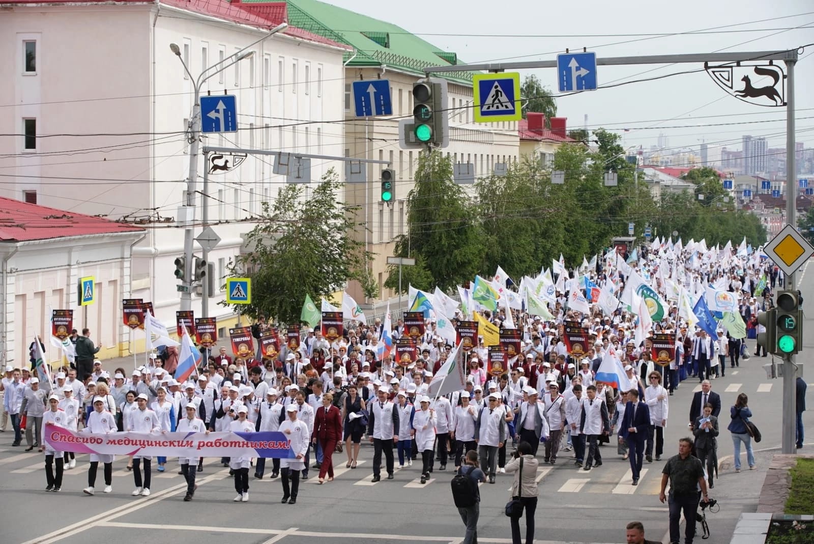 А потом в 12 часов 50 минут стартовал парад медицинских работников. Шествие прошло по улице Заки Валиди до конгресс-холла «Торатау», с символикой и флагами медицинских организаций. А саму колонну вели ветераны и династии здравоохранения.