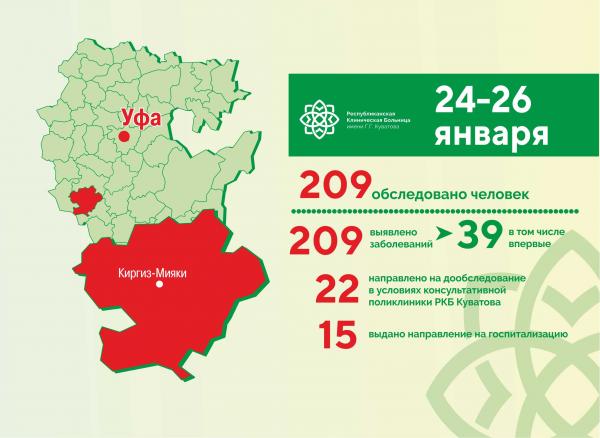 В ходе поездки специалистами РКБ им. Г.Г. Куватова было обследовано – 209 человек, у 209 - были выявлены заболевания, в том числе впервые у – 39 человек. На дообследование в условиях консультативной поликлиники в РКБ им. Г.Г. Куватова направлено 22, а также было выдано направление на госпитализацию – 15 пациентам.