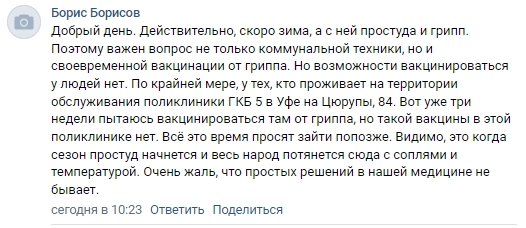 Житель Уфы пожаловался Главе Башкирии Радию Хабирову на невозможность вакцинироваться от гриппа. По словам горожанина, который оставил свой комментарий под постом руководителя региона, он безуспешно в течение трех недель обращался в поликлинику по месту жительства, но там лишь отвечали, что вакцины нет и просили зайти позже. - Добрый день. Действительно, скоро зима, а с ней простуда и грипп. Поэтому важен вопрос не только коммунальной техники, но и своевременной вакцинации от гриппа. Но возможности вакцинироваться у людей нет. По крайней мере, у тех, кто проживает на территории обслуживания поликлиники ГКБ 5 в Уфе на Цюрупы, 84. Вот уже три недели пытаюсь вакцинироваться там от гриппа, но такой вакцины в этой поликлинике нет. Всё это время просят зайти попозже. Видимо, это когда сезон простуд начнется и весь народ потянется сюда с соплями и температурой. Очень жаль, что простых решений в нашей медицине не бывает, - написал Борис Б.